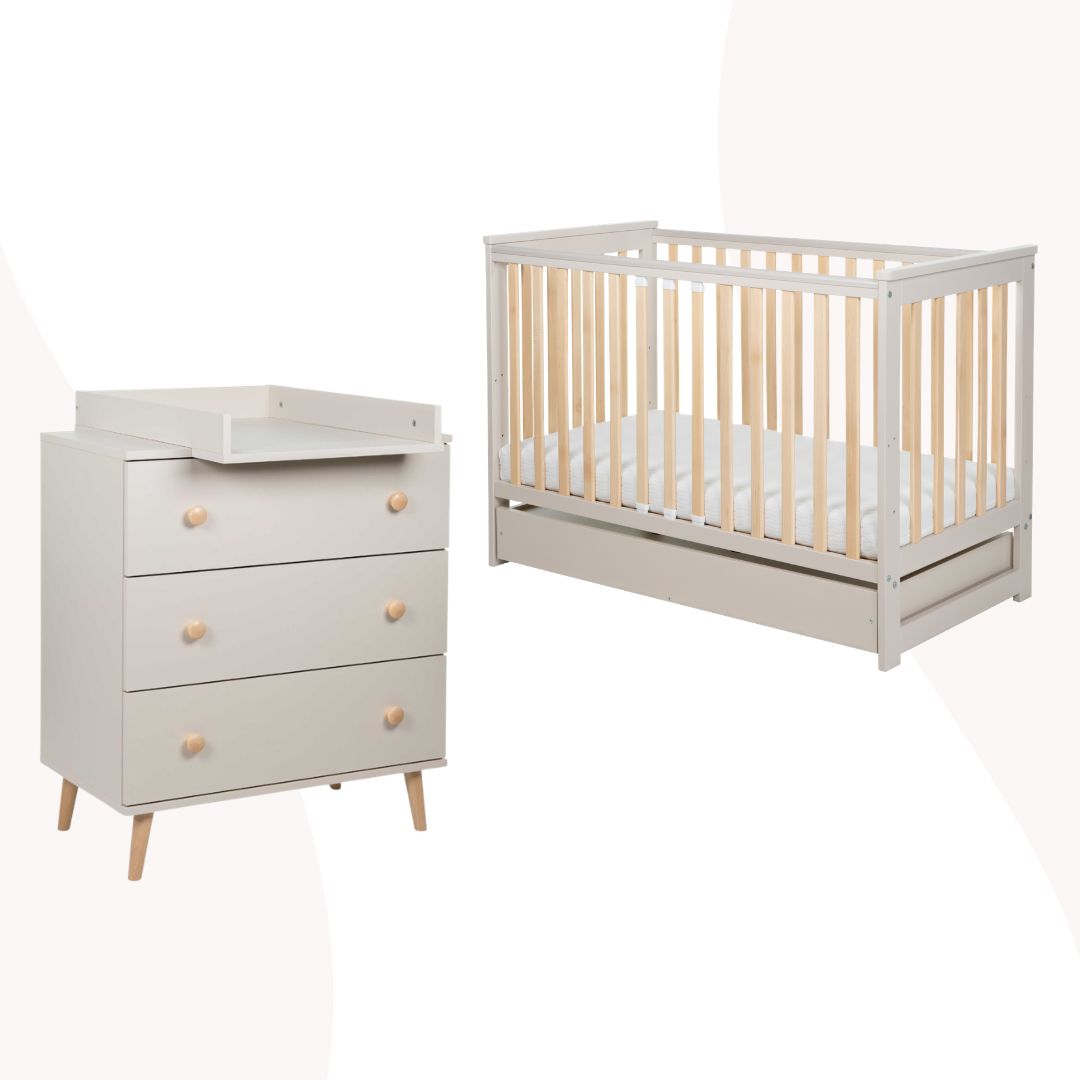 Zestaw beżowych mebli do dziecięcego pokoiku składa się z ponadczasowej komody oraz wyjątkowego łóżeczka IWI, łącząc funkcjonalność, trwałość i styl, by stworzyć idealną przestrzeń dla malucha i całej rodziny.