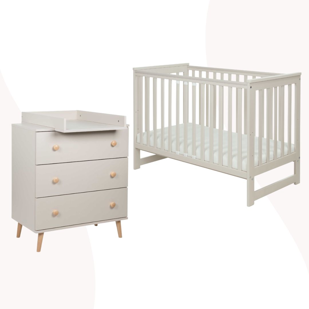Zestaw beżowych mebli do dziecięcego pokoiku składa się z ponadczasowej komody oraz wyjątkowego łóżeczka IWI, łącząc funkcjonalność, trwałość i styl, by stworzyć idealną przestrzeń dla malucha i całej rodziny.