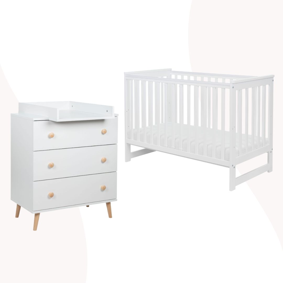 Zestaw białych mebli do dziecięcego pokoiku składa się z ponadczasowej komody oraz wyjątkowego łóżeczka IWI, łącząc funkcjonalność, trwałość i styl, by stworzyć idealną przestrzeń dla malucha i całej rodziny.