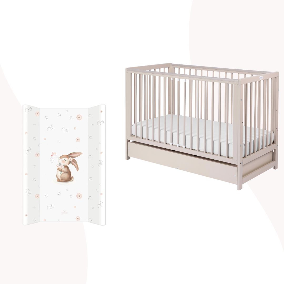 ZESTAW Łóżeczko IWI beżowe z szufladą i barierką + przewijak twardy króliczek