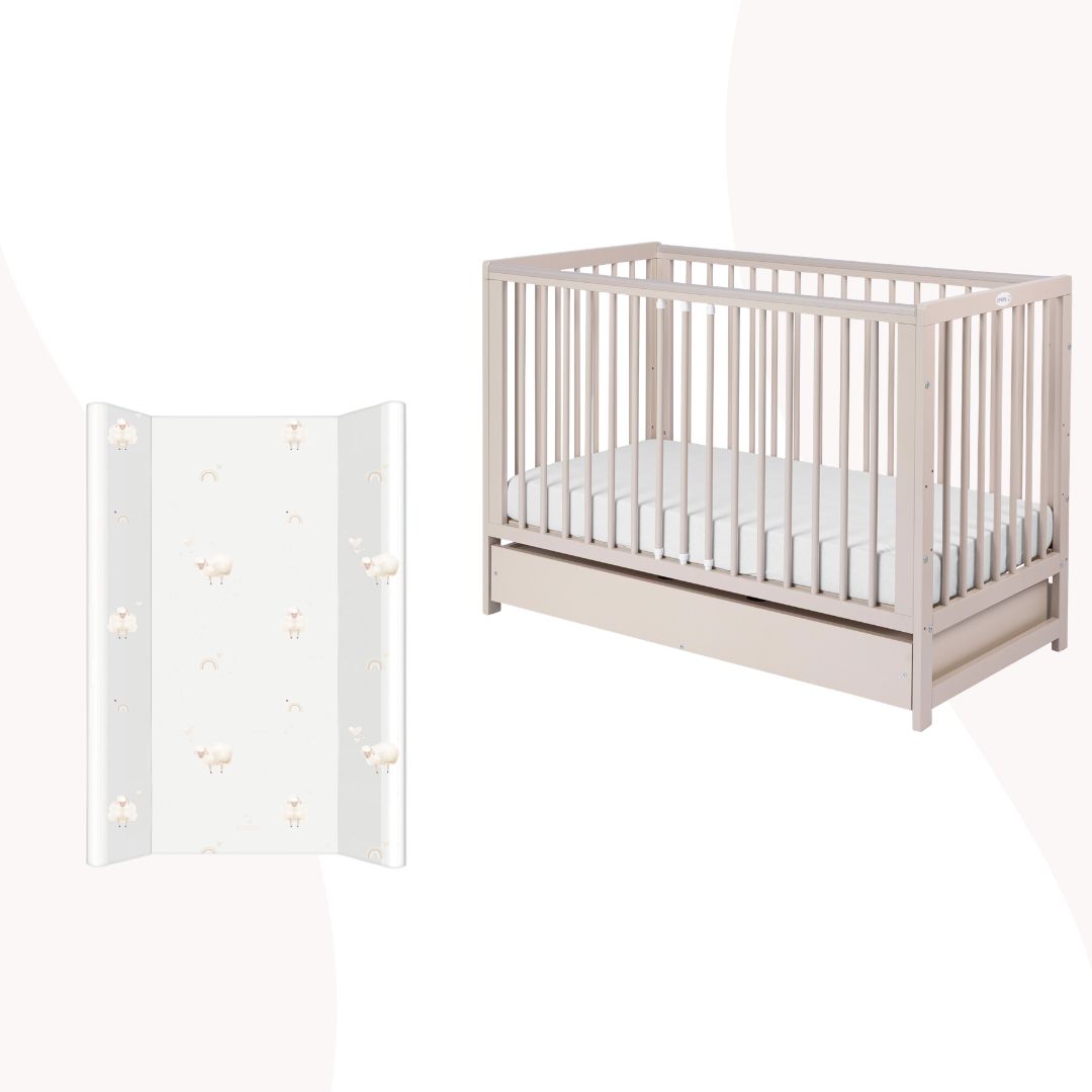 ZESTAW Łóżeczko IWI beżowe z szufladą i barierką + przewijak twardy owieczka 01