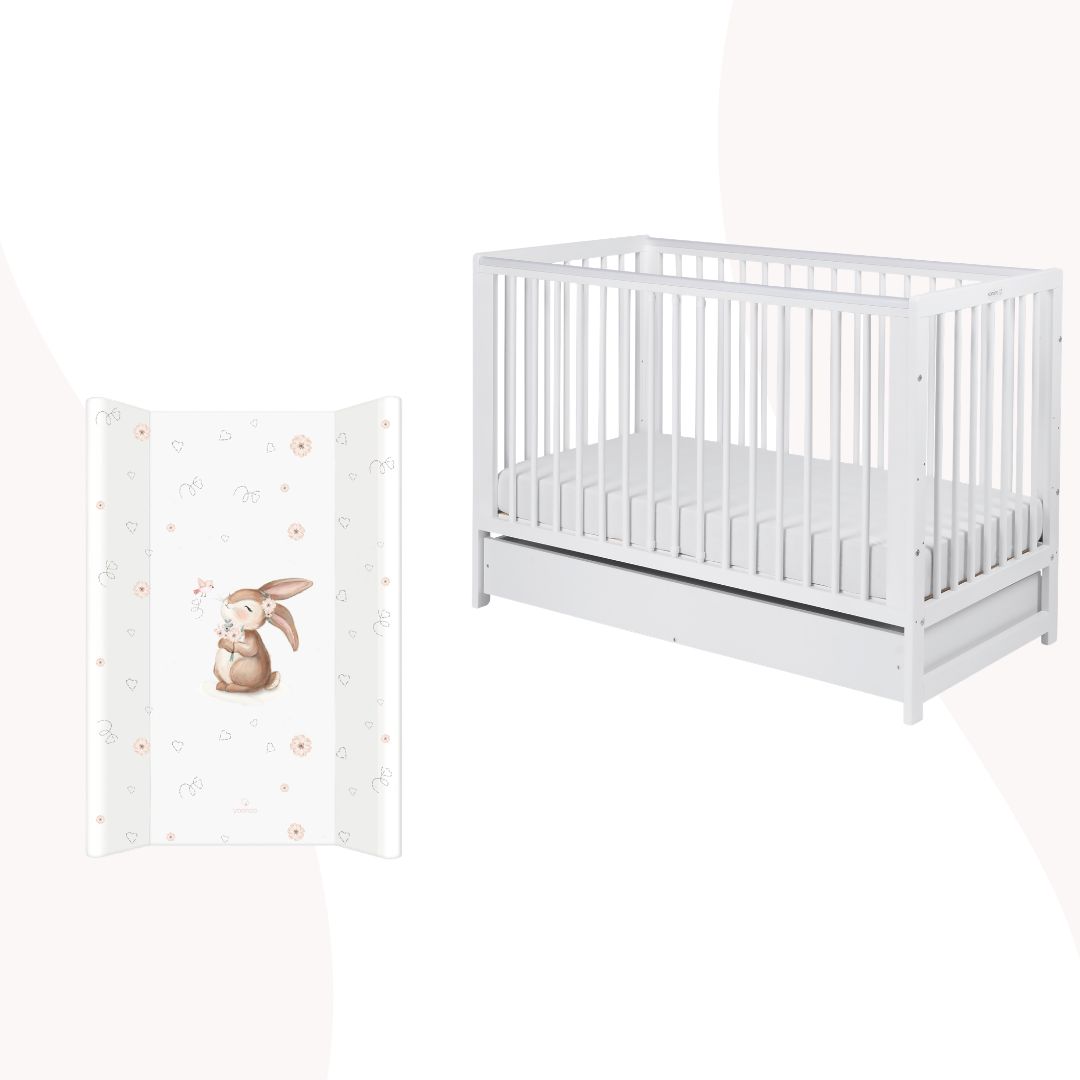 ZESTAW Łóżeczko IWI białe z szufladą i barierką + przewijak twardy króliczek